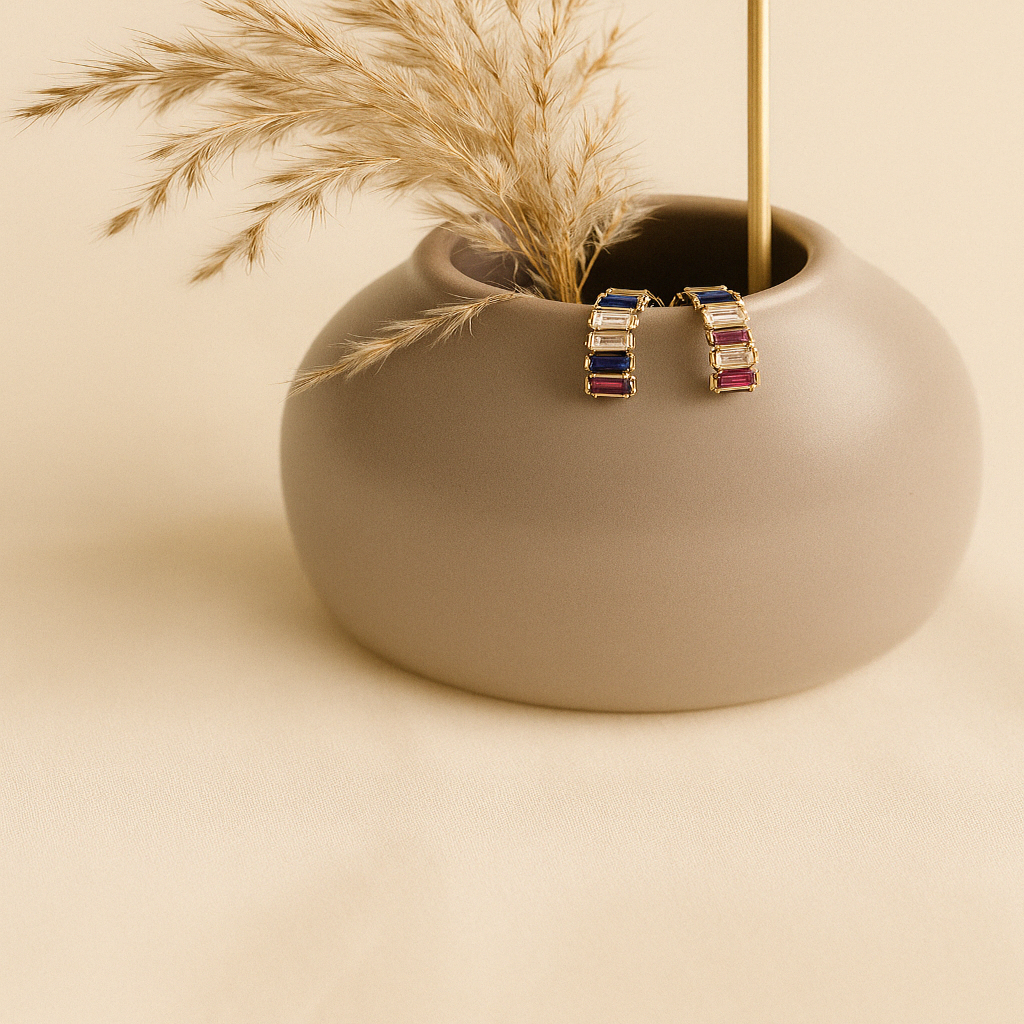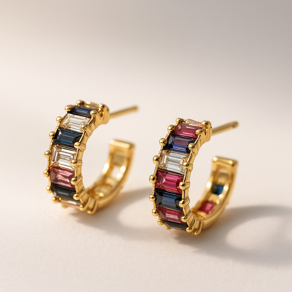 Elevate your jewelry collection with our Aurora Baguette Gemstone Hoop Earrings — a radiant celebration of color, craftsmanship, and sophistication. Designed in lustrous 18K gold-plated brass, each hoop features a stunning arrangement of baguette-cut gemstones in deep sapphire blue, blush rose, and classic crystal, capturing the light with every turn.