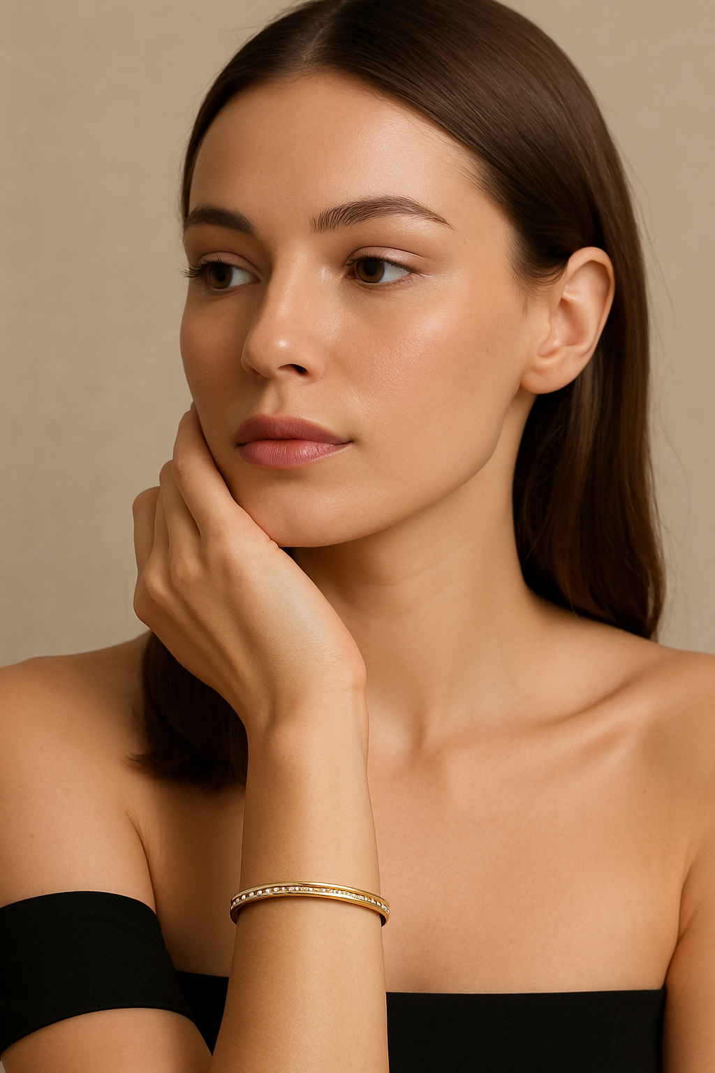 This exquisite gold bangle is a true statement of sophistication. Expertly crafted from high-quality gold, it features a graceful arc of meticulously set diamond accents that add just the right touch of sparkle